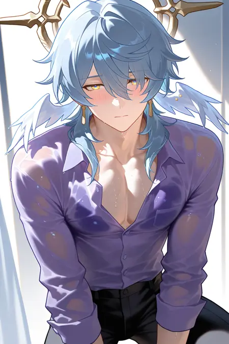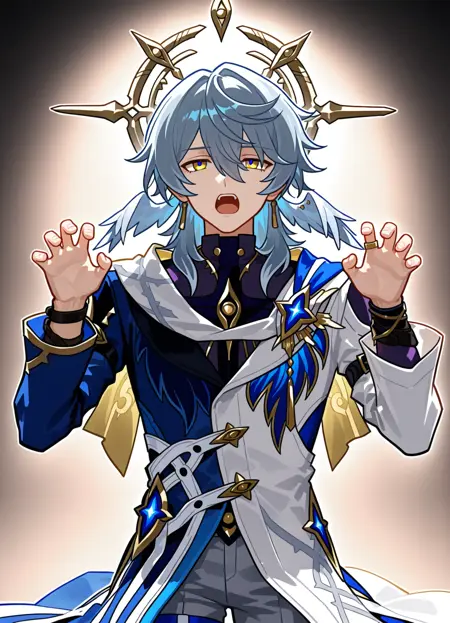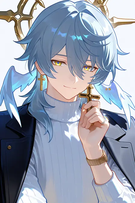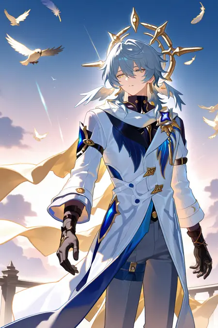 sunday \(honkai star rail\),1boy,head wings,male focus,gloves,solo,wings,black gloves,jewelry,hair between eyes,long sleeves,earrings,ring,pants,coat, feathers, halo, scarf, white coat,
