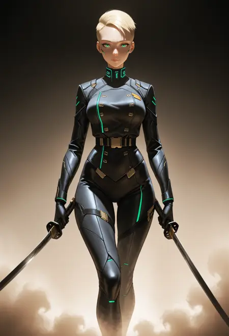 CyberSandraDorsett, 1girl, blonde hair, short hair, green eyes