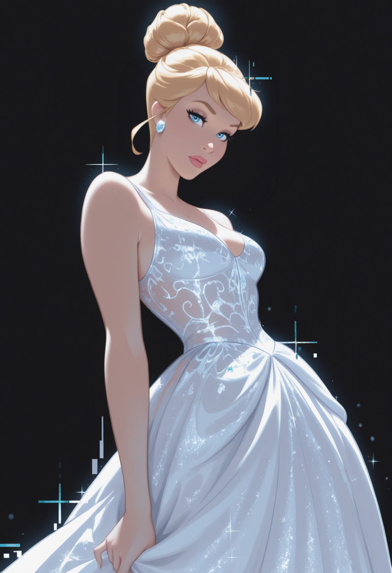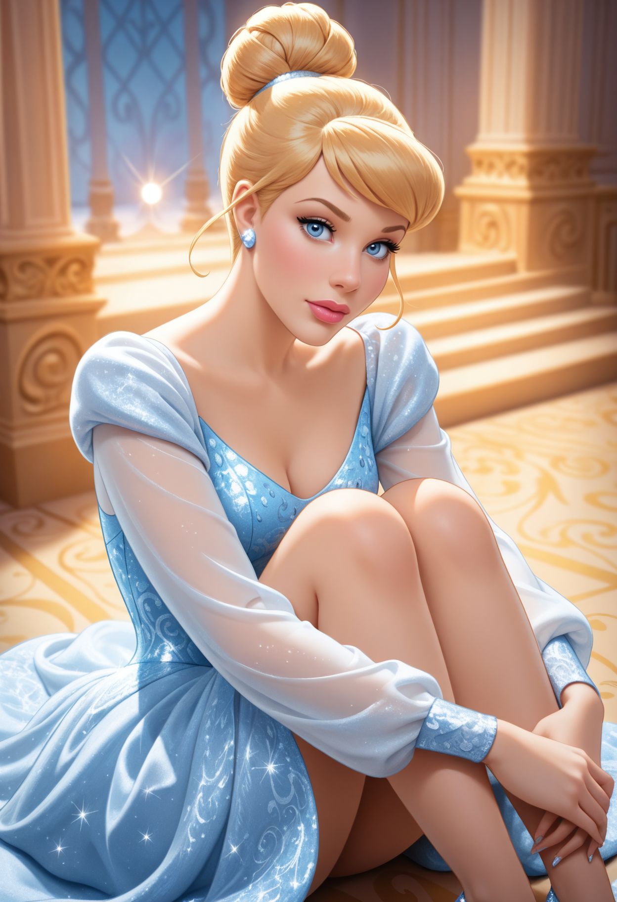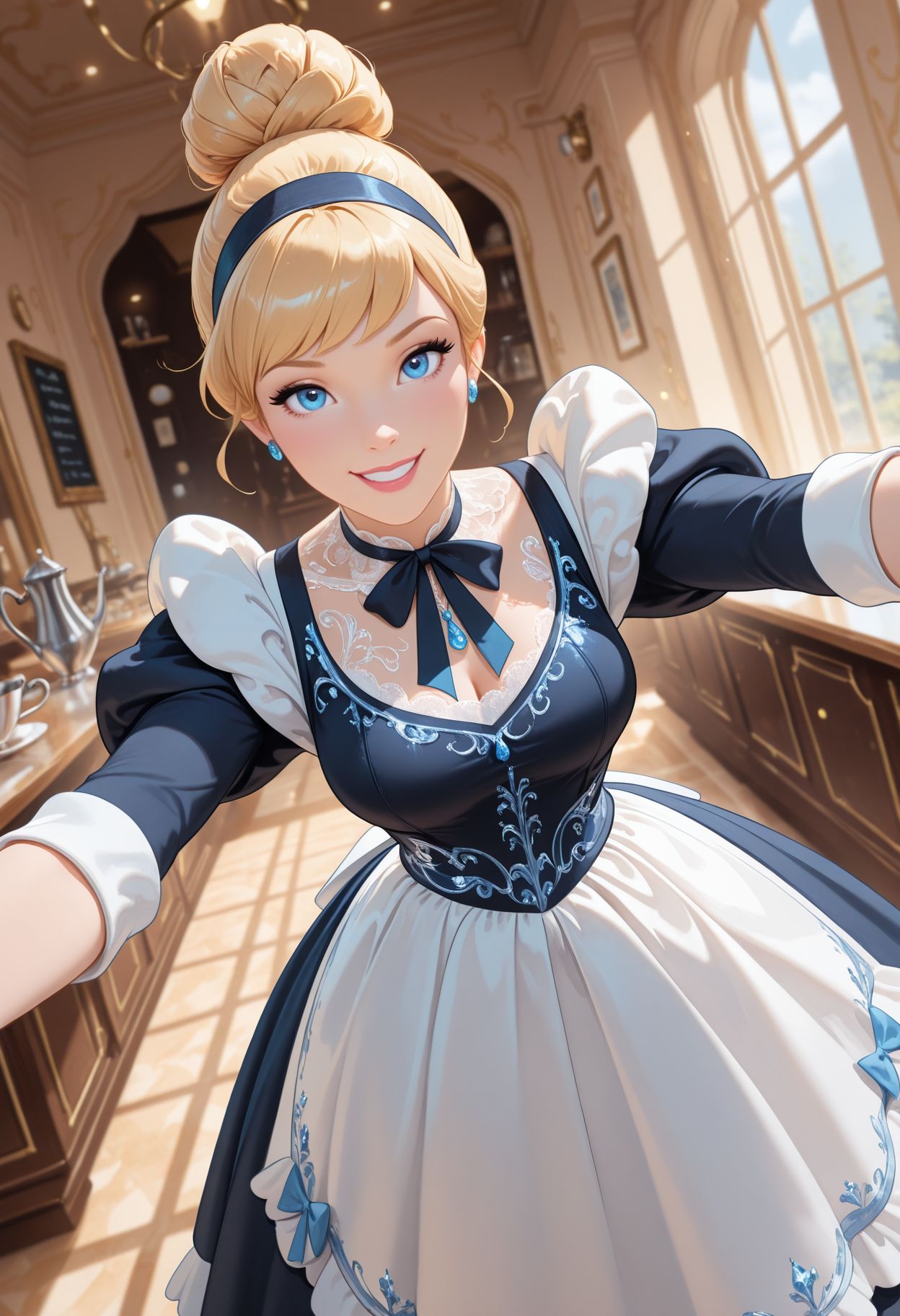 DCinderella, 1girl, blonde hair, hair bun, blue eyes