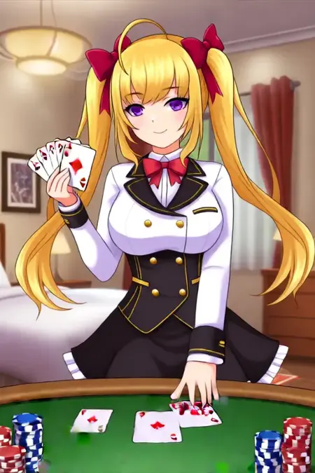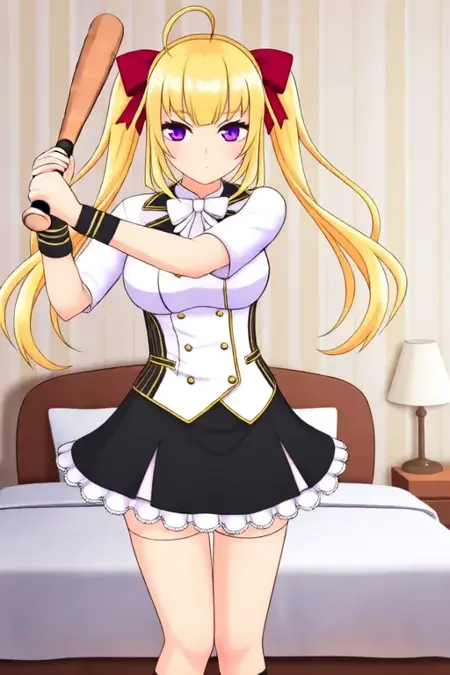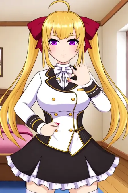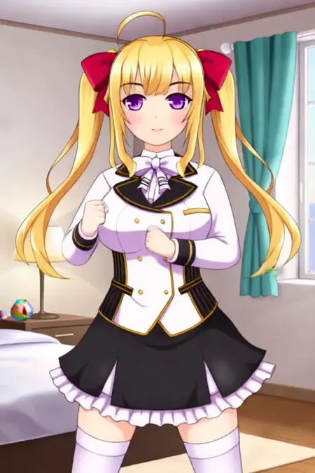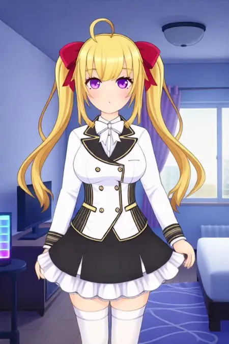 触发词:Takamiya Rion,动漫风格女孩。图像展现一名动漫风格角色,拥有长及双马尾的金发,每条马尾均装饰红色蝴蝶结。角色拥有鲜明的紫色眼睛,身着白色制服,边缘为黑色装饰。制服包括高领配大蝴蝶结、金色纽扣,胸前有黑金配色徽章,搭配黑色百褶裙边及白色过膝袜。