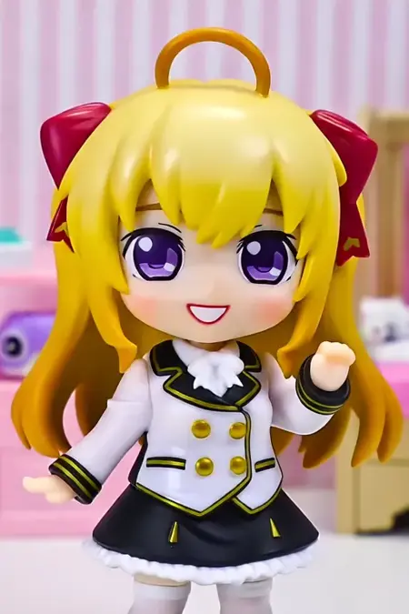 示例提示词:Takamiya Rion,动漫风格女孩。图像展现一名动漫风格角色,拥有长及双马尾的金发,每条马尾均装饰红色蝴蝶结。角色拥有鲜明的紫色眼睛,身着黑色镶边、金色纽扣的白色上衣,搭配黑色百褶裙边,(她正在跳舞:2.5),(Q版Nendoroid:3.5),在卧室中。