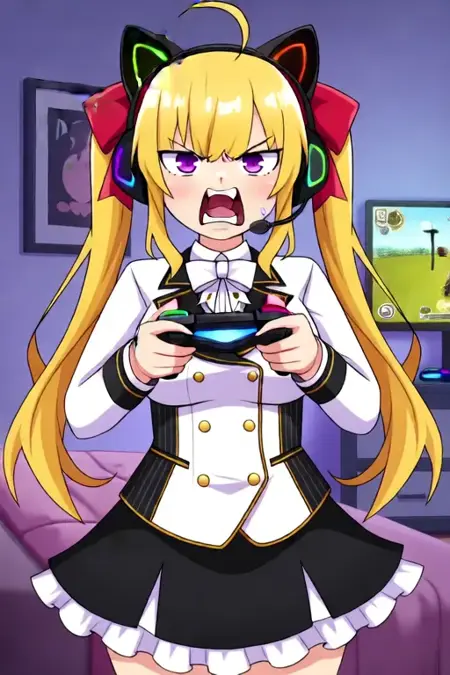 触发词:Takamiya Rion,动漫风格女孩。图像展现一名动漫风格角色,拥有长及双马尾的金发,每条马尾均装饰红色蝴蝶结。角色拥有鲜明的紫色眼睛,身着黑色镶边、金色纽扣的白色上衣,搭配黑色百褶裙边。