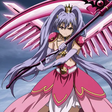 力量形态触发词:RenPowered, 1girl, 镰刀, 翅膀, 魔法少女, 肘套, 双马尾, 紫发, 红眼, 王冠, 牛仔构图