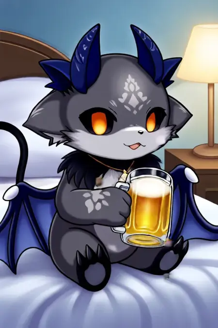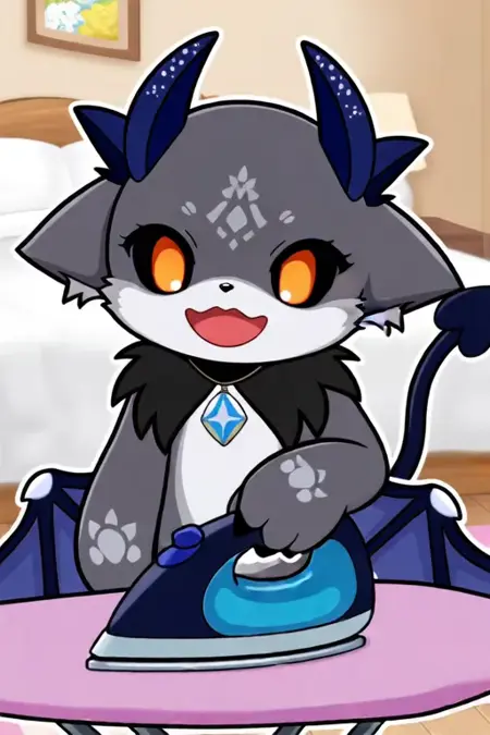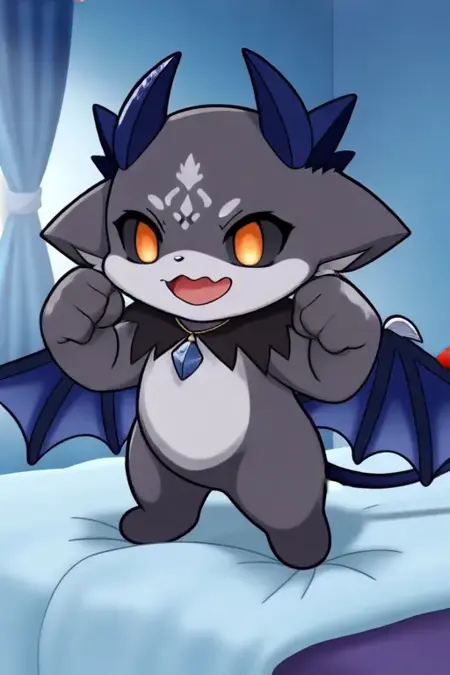 sample prompt:Debidebi debiru, anime-style animal. The image features an anthropomorphic character with dark gray fur and a white muzzle. The character has a orange eyes and a wide, toothy. Its ears are pointed and have a dark blue hue with white markings. The character is wearing a black cape with blue accents and has a small, purple gemstone pendant around its neck. (she is dancing:4.0), (chibi Nendoroid:4.5) in bedroom.