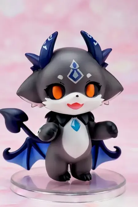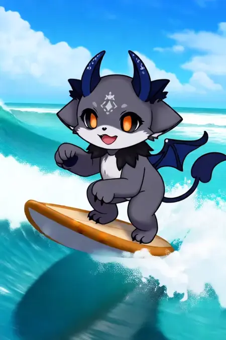 sample prompt:Debidebi debiru, anime-style animal. The image features a cute, anthropomorphic creature with a dark gray fur coat. The character has large, expressive orange eyes that stand out prominently against its fur. Its ears are pointed and have a darker shade of gray, with blue accents on the tips. The character's tail is long and curved, with a similar dark gray color, (she is dancing:2.5), (chibi Nendoroid:3.5) in bedroom.