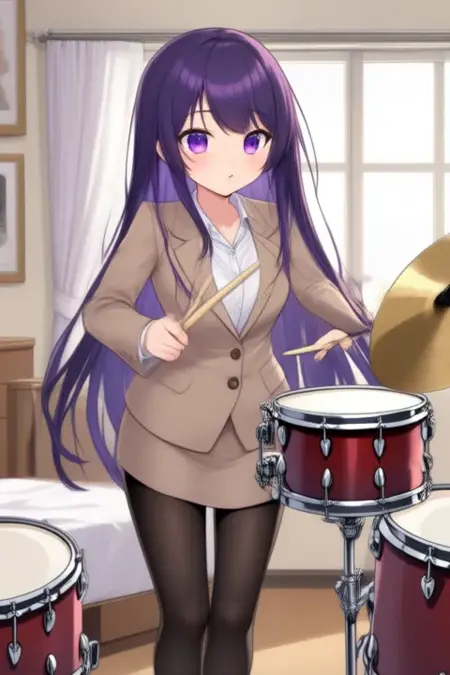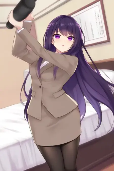 sample prompt:Gundou Mirei, anime-style girl. The image features an anime-style character with long, dark purple hair that flows down past her shoulders. Her hair is styled straight and falls naturally around her face. The character has large, expressive purple eyes that stand out prominently against her skin tone.She is wearing a light brown suit jacket over a white collared shirt. The jacket is buttoned up to the top, revealing a bit of her chest. Underneath the jacket, she has on a white collared shirt with a small collar and a tie. She also wears black tights that cover her legs. (she is dancing:2.5), (chibi Nendoroid:3.5) in bedroom.