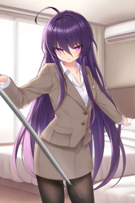 Trigger Word:Gundou Mirei, anime-style girl. The image features an anime-style character with long, dark purple hair that flows down past her shoulders. Her hair is styled straight and falls naturally around her face. The character has large, expressive purple eyes that stand out prominently against her skin tone.She is wearing a light brown suit jacket over a white collared shirt. The jacket is buttoned up to the top, revealing a bit of her chest. Underneath the jacket, she has on a white collared shirt with a small collar and a tie. She also wears black tights that cover her legs