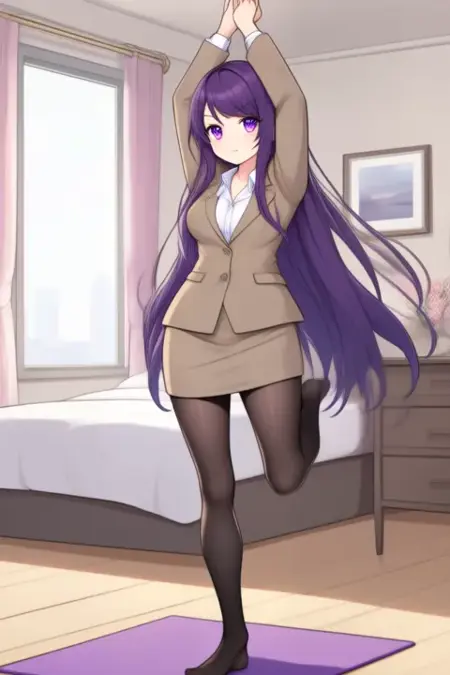 샘플 프롬프트: Gundou Mirei, anime-style girl. The image features an anime-style character with long, dark purple hair that flows down past her shoulders. Her hair is styled straight and falls naturally around her face. The character has large, expressive purple eyes that stand out prominently against her skin tone. She is wearing a light brown suit jacket over a white collared shirt. The jacket is buttoned up to the top, revealing a bit of her chest. Underneath the jacket, she has on a white collared shirt with a small collar and a tie. She also wears black tights that cover her legs. (she is dancing:2.5), (chibi Nendoroid:3.5) in bedroom.