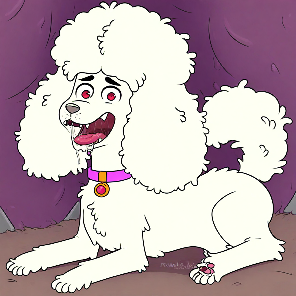 Dog, poodle, white fur, black eyes, puffy tail, puffy ears, grey nose, pink collar,