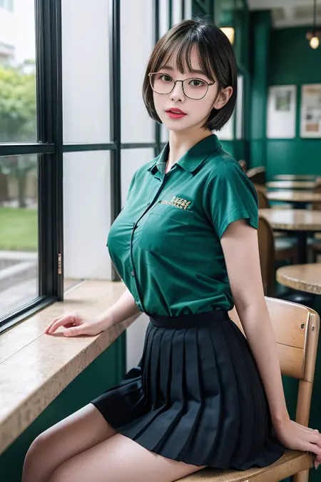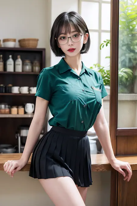 觸發詞: tfgv2, black thighhighs, bangs, short sleeves, shirt tucked in, black pleated skirt, loafers, green shirt, breast pocket, clothes writing,