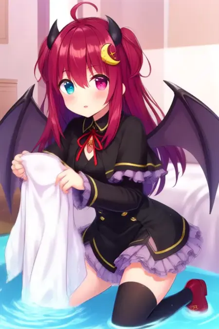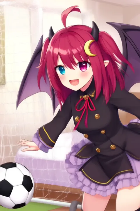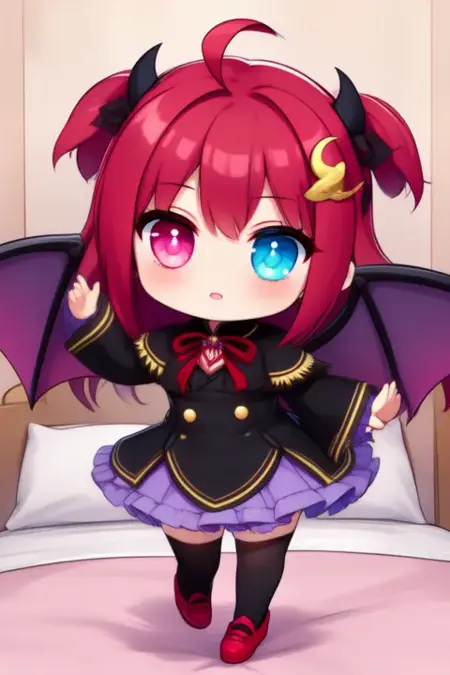 샘플 프롬프트: Yuduki Roa, 애니메이션 스타일의 소녀. 이미지에는 밝은 빨간색 머리카락을 트윈 테일로 스타일링한 애니메이션 스타일의 캐릭터가 등장합니다. 캐릭터는 파랑과 분홍이 혼합된 큰 표현력 있는 눈을 가지고 있어 독특한 외모를 자랑합니다. 이마에는 초승달 모양의 액세서리가 장식되어 있습니다. 캐릭터는 검은색 옷에 금색 악세서리가 포함되어 있으며, 높은 칼라와 목에 매달린 빨간 리본이 특징입니다. 옷에는 금색 단추와 주름진 헤매가 있으며, 날개는 어두운 보라색 깃털과 밝은 보라색 테두리로 이루어져 있어 판타지적인 외모를 더해주며, 무릎까지 오는 양말을 신고 있습니다, (그녀가 춤추고 있음:2.5), (치비 넌도로이드:3.5) 침실에서.
