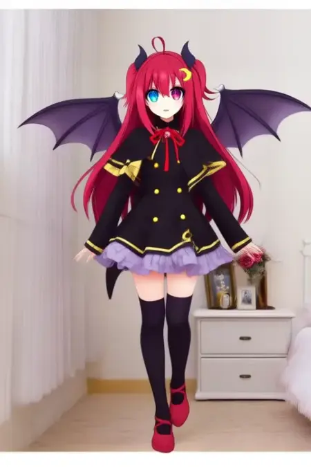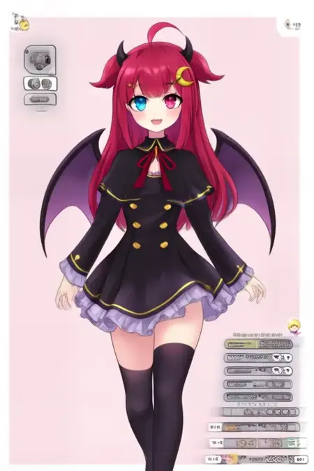 트리거 단어: Yuduki Roa, 애니메이션 스타일의 소녀. 이미지에는 밝은 빨간색 머리카락을 트윈 테일로 스타일링한 애니메이션 스타일의 캐릭터가 등장합니다. 캐릭터는 파랑과 분홍이 혼합된 큰 표현력 있는 눈을 가지고 있어 독특한 외모를 자랑합니다. 이마에는 초승달 모양의 액세서리가 장식되어 있습니다. 캐릭터는 검은색 옷에 금색 악세서리가 포함되어 있으며, 높은 칼라와 목에 매달린 빨간 리본이 특징입니다. 옷에는 금색 단추와 주름진 헤매가 있으며, 날개는 어두운 보라색 깃털과 밝은 보라색 테두리로 이루어져 있어 판타지적인 외모를 더해주며, 무릎까지 오는 양말을 신고 있습니다.