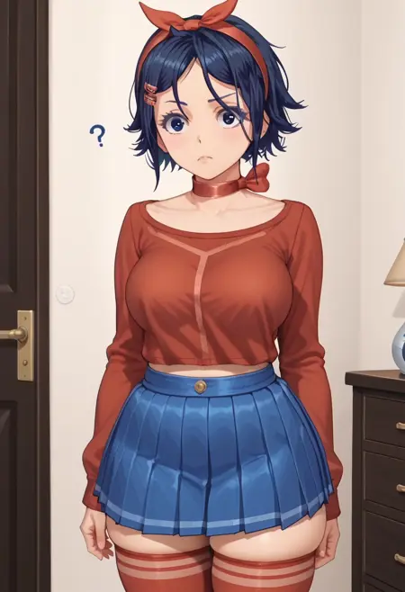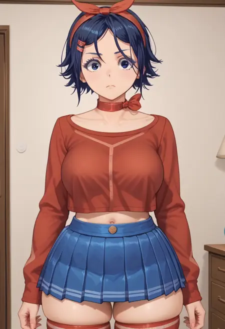 | Trained Words | Short-haired_Mita_(MiSide), 1girl, blue hair, short hair, hair bow, blue eyes, red headband, red hairclip, hair ornament, red choker, red shirt, long sleeves, navel, midriff, blue skirt, pleated, pleated skirt, red stockings, blue shoesCopied! |