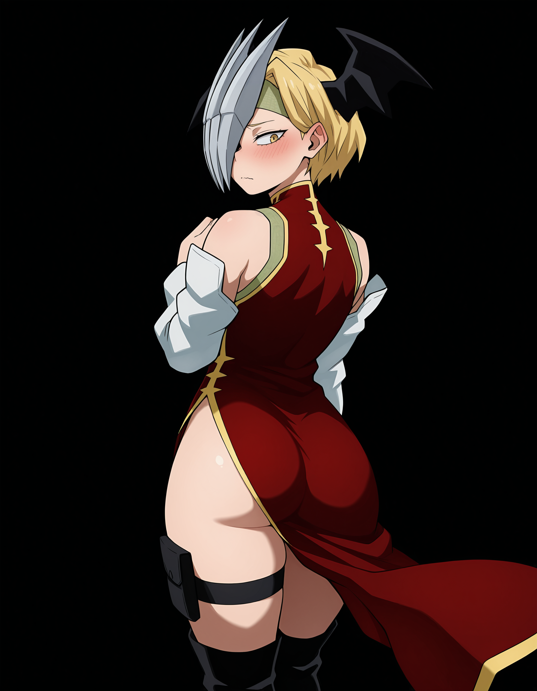 Hero: ryukohero, china dress, red dress, turtleneck dress, side slit, half mask, head wings, green headband, detached sleeves, bare shoulders, thigh strap, black boots