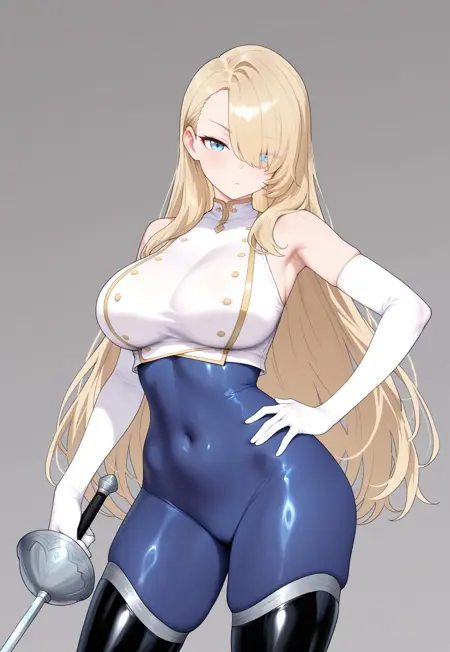 wilhelmina-SL,大胸,蓝眼睛,头发遮住一只眼,长发,金发,白色无袖短上衣,金色纽扣,白色肘部手套,蓝色紧身裤,黑色过膝长靴,