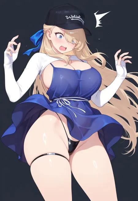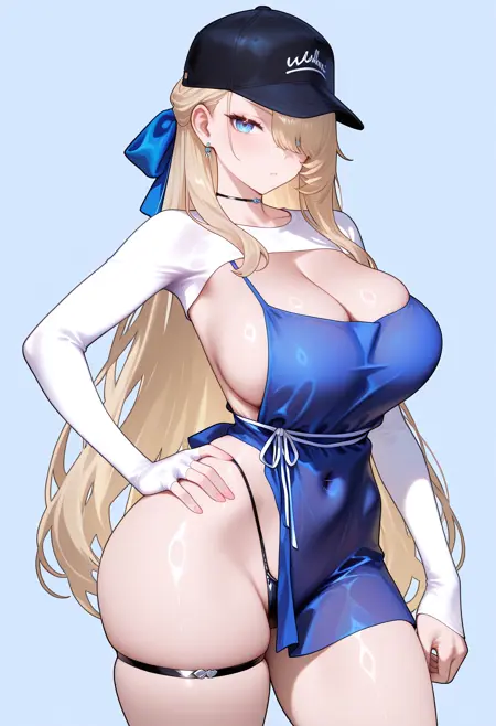 wilhelmina-WQ,大胸,蓝眼睛,头发遮住一只眼,长发,金发,黑色棒球帽,蓝色发带,白色短开衫,蓝色围裙连衣裙,深V领口,白色腰带,黑色大腿绑带,黑色丁字裤,白色凉鞋,