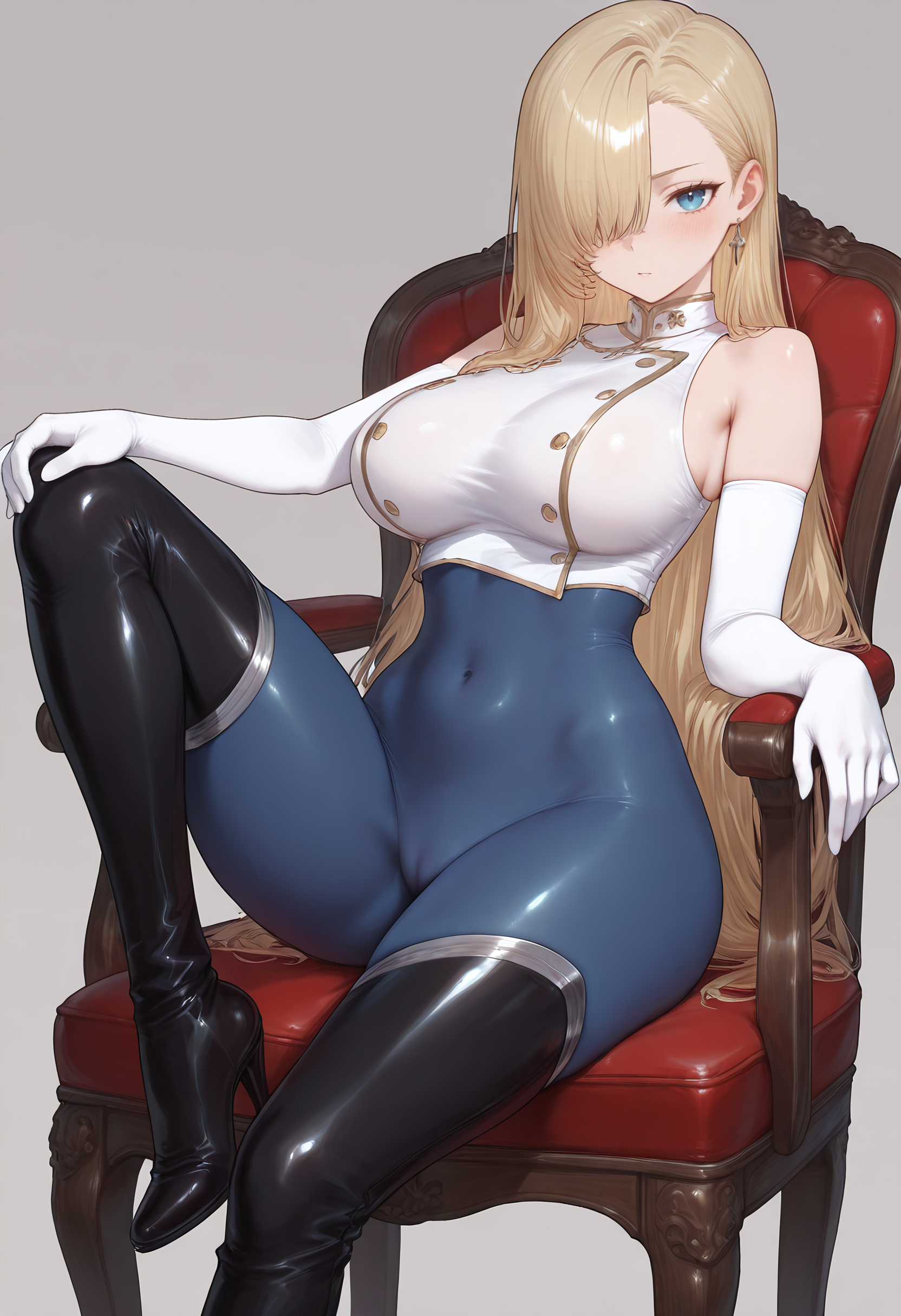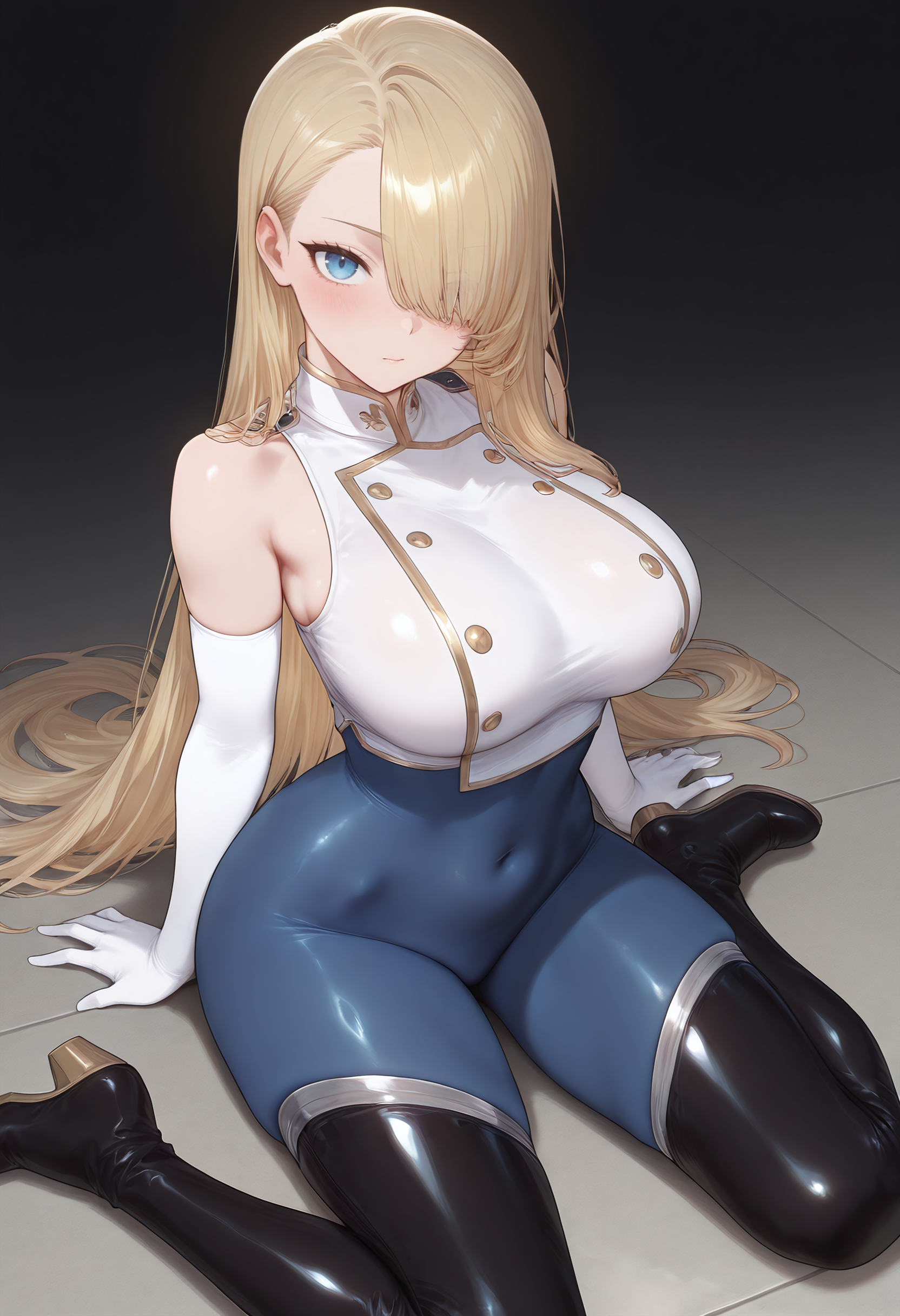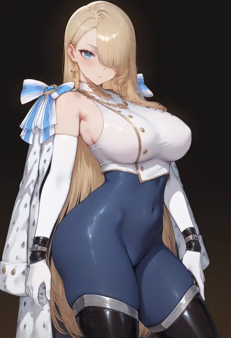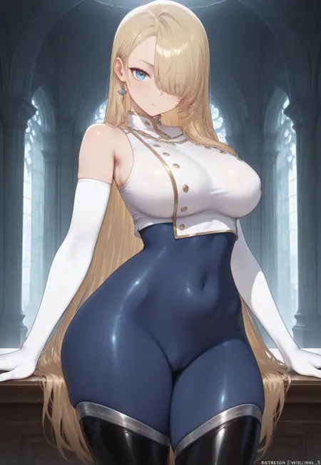 wilhelmina-SL, large breasts, blue eyes, hair over one eye, long hair, blonde hair, white sleeveless crop_top, gold buttons, white elbow gloves, blue bodysuit bottoms, black thigh high boots,