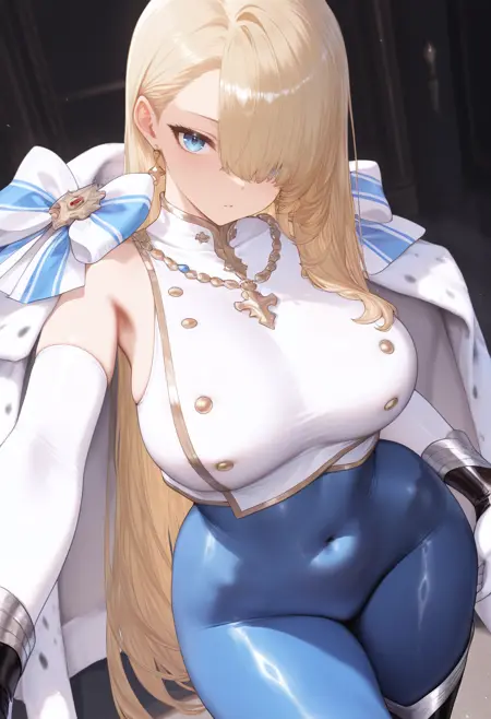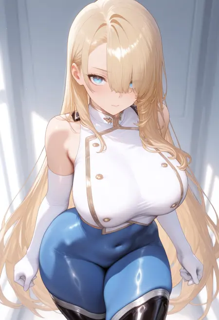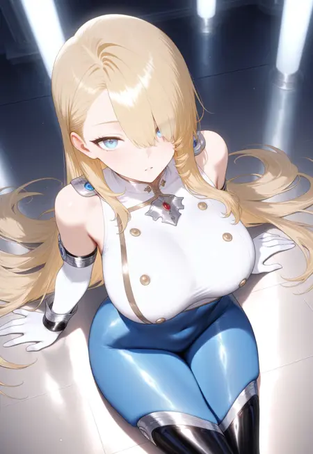 wilhelmina-SL,大胸,蓝眼睛,头发遮住一只眼,长发,金发,白色无袖短上衣,金色纽扣,白色肘部手套,蓝色紧身裤,黑色过膝长靴,