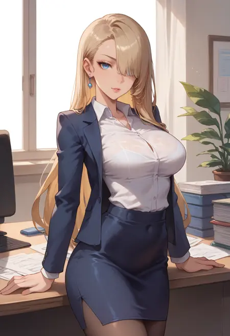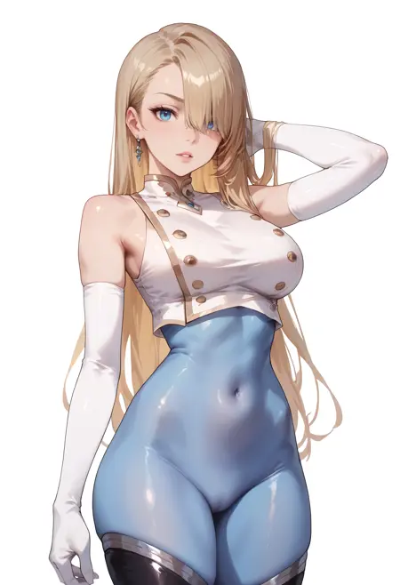 wilhelmina-SL, large breasts, blue eyes, hair over one eye, long hair, blonde hair, white sleeveless crop_top, gold buttons, white elbow gloves, blue bodysuit bottoms, black thigh high boots,