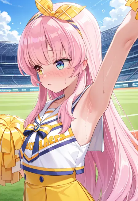 推荐提示:长发、粉发、黄蓝异瞳、黄色格子发带、水手领、短上衣、黄色百褶裙、啦啦队腕带、啦啦队高筒袜、粉红色运动鞋、紫色绒球、黄色绒球、渐变绒球、手持绒球