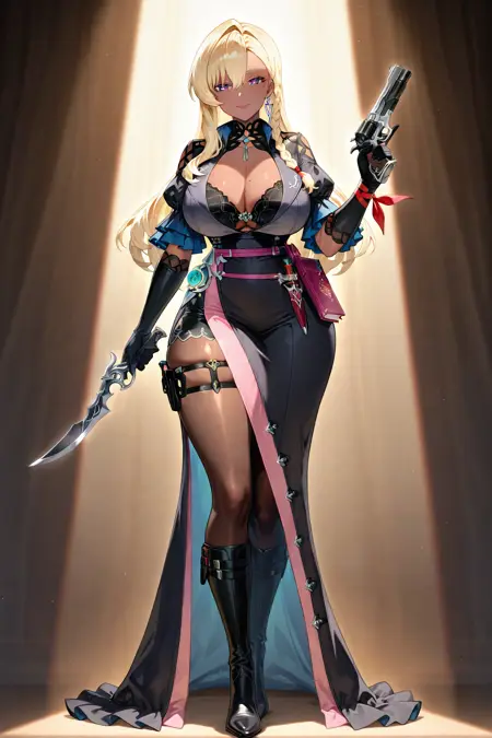 프릴 장식 소매, 짧은 소매, 손목 리본, 빨간 리본, 팔꿈치 장갑, 검은 장갑, 사이드 슬리트 드레스, 프릴 드레스, 긴 드레스, 허리 벨트, 분홍색 벨트, 분홍색 가방, 허리에 착용한 책, 미니쇼츠, 검은 쇼츠, 갈색 팬티스타킹, 허벅지 스트랩, 허벅지 홀스터, 시험관 홀스터, 무릎 부츠, 하이힐 부츠, 검은 하이힐,
