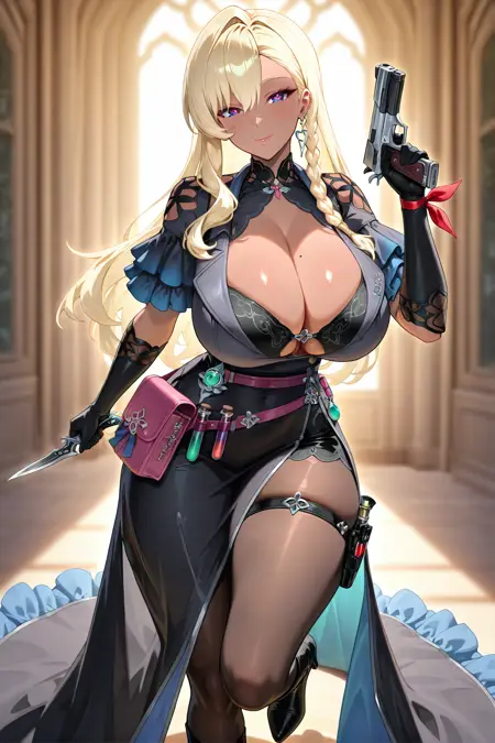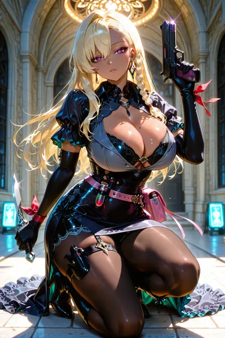 荷叶边袖子,短袖,手腕丝带,红色丝带,肘部手套,黑色手套,侧开衩连衣裙,荷叶边连衣裙,长裙,腰带,粉色腰带,粉色包包,悬挂书籍,超短裤,黑色短裤,棕色连裤袜,大腿绑带,大腿枪套,试管枪套,及膝靴,高跟靴,黑色高跟鞋,