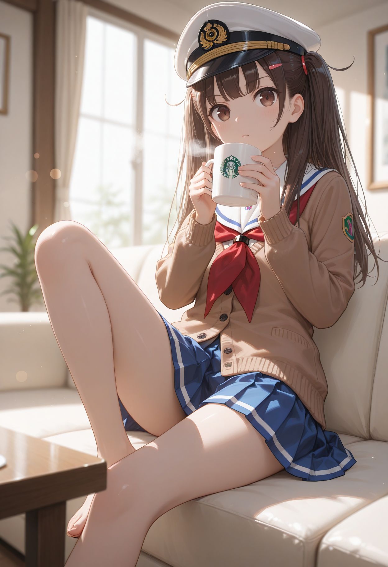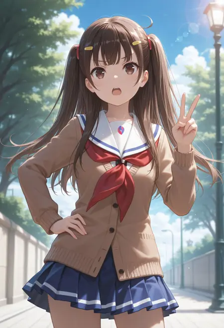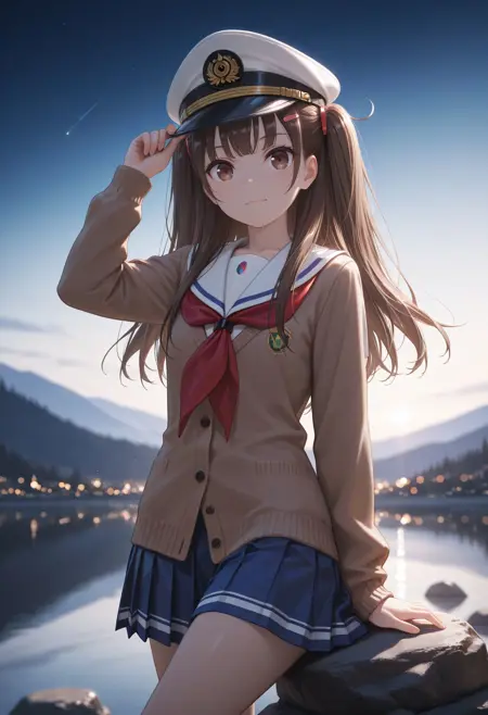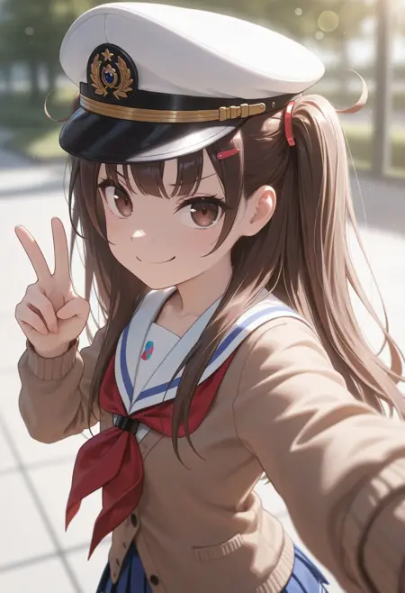 触发词:1girl, brown eyes, long hair, brown hair, two side up, hairclip, school uniform, serafuku, hair ornament, white peaked cap, pleated skirt, blue skirt, cardigan,