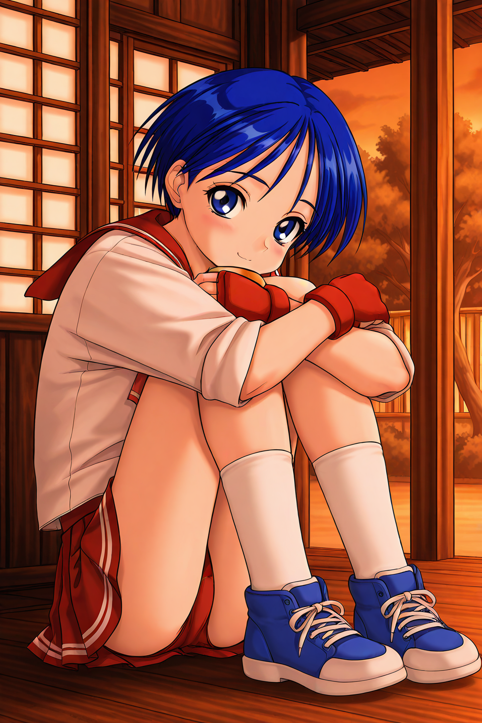 school uniform,serafuku,red sailor collar,pink shirt,red bowtie,long sleeves,sleeves rolled up,red skirt,miniskirt,pleated skirt,white line,red buruma,kneehighs,white socks,sneakers,blue footwear,