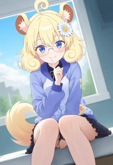 blonde hair,blue eyes,ahoge,hair flower,hair ornament,animal ears,tail,glasses