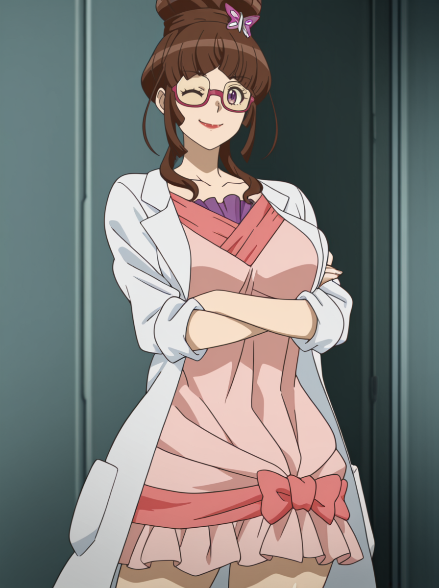 ryoko:1人のお姫様、単体、ryokosympho、茶色の髪、眼鏡、長い髪、片方の髪を結んだスタイル、口紅、実験着、笑顔