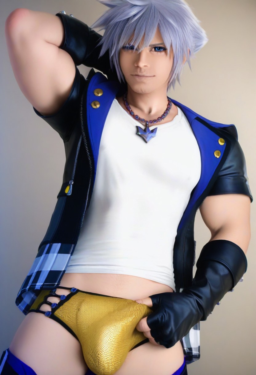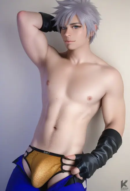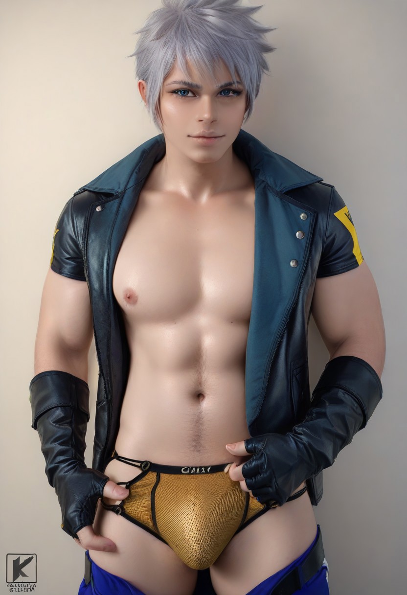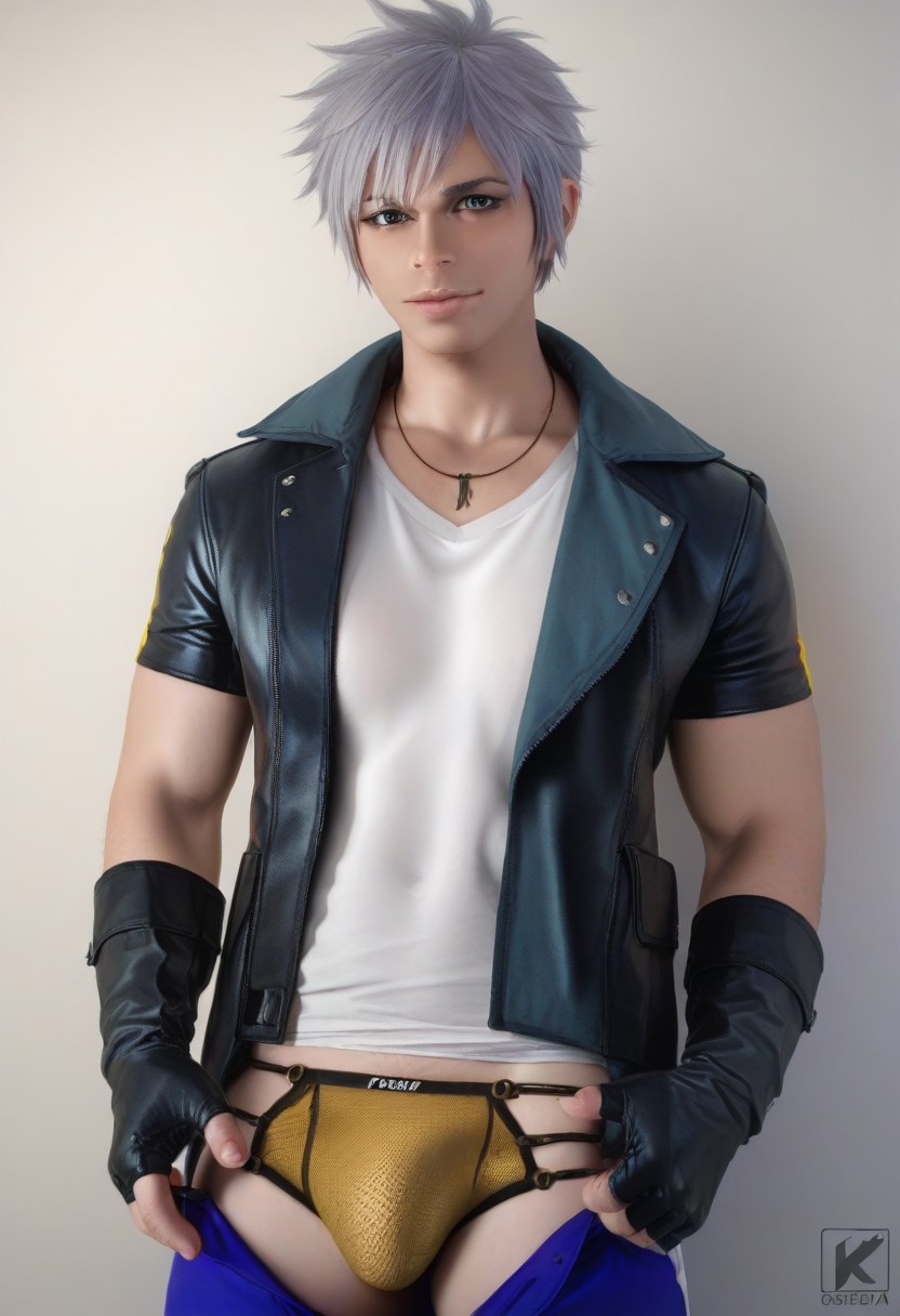 Male Cosplayer, gray hair, spiked hair, blue eyes, necklace, white undershirt, open jacket, fingerless arm gloves, yellw erotic underwear, see-through underwear, bulge, blue pants pulled down