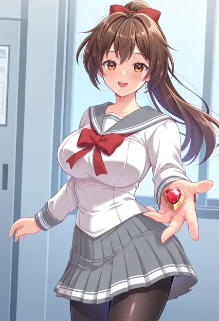 通常版: poniceress、茶色の目、茶色の髪、長い髪、ポニーテール、大きな胸、赤いリボン、灰色のセーラー collar、白いシャツ、長袖、灰色のスカート、黒いパンスト、茶色のアンクルブーツ、