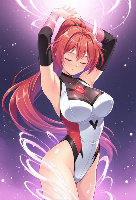 変形版: poniceress、緑の目、赤い髪、長い髪、ポニーテール、大きな胸、ピンクのリボン、赤いセーラー collar、胸のジュエル、短めのベスト、レオタード、白い手袋、肘までカバー、ベルト、白いスカート、黒いタイツ、白いアンクルブーツ、