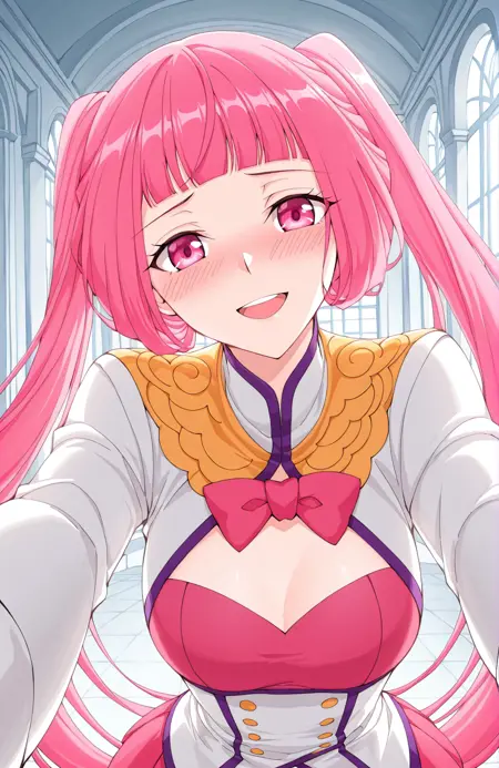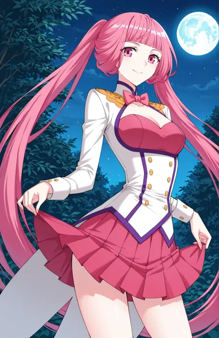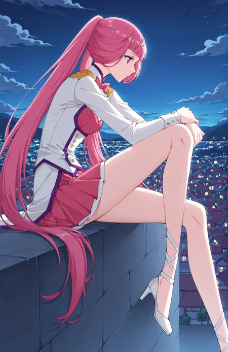 Nalan_outfit, white jacket, purple trim, gold buttons, long sleeves, buttoned cuffs, gold epaulets, pink bow, inner top, pink top, sleeveless top, short skirt, pink skirt, pleated skirt, high heels, white heels, ankle strap heels,