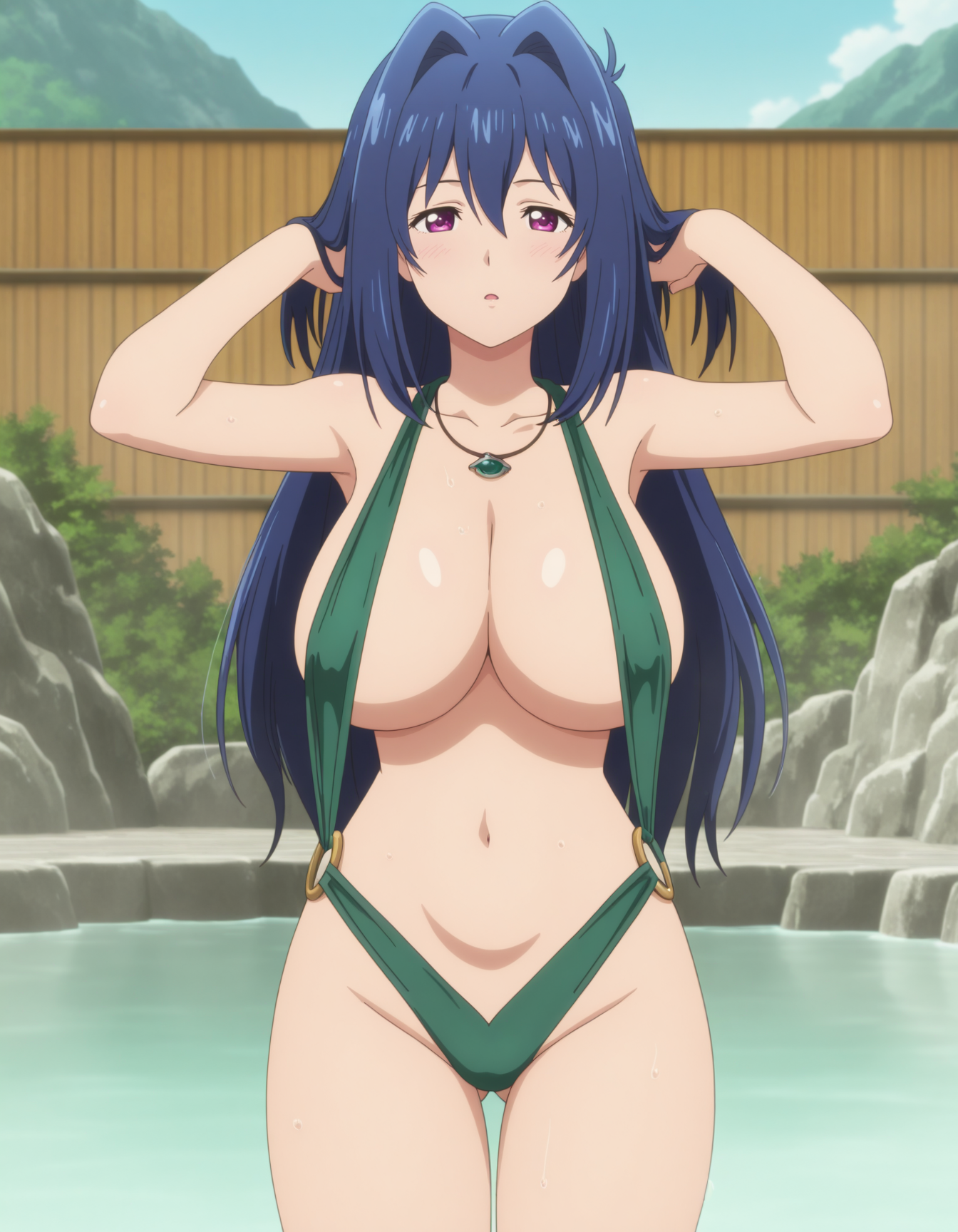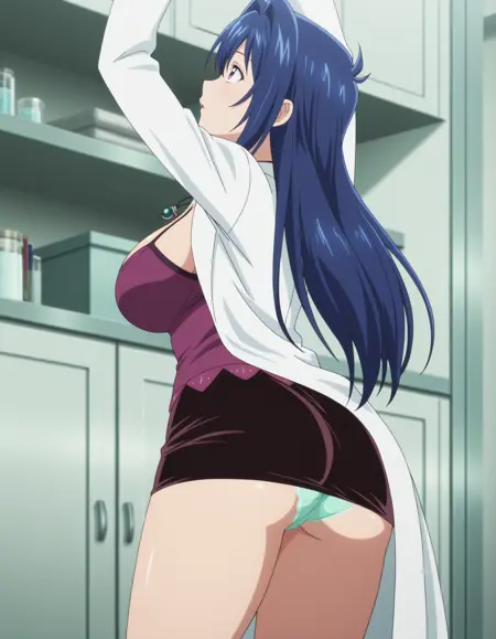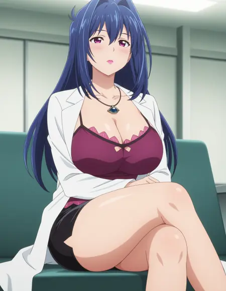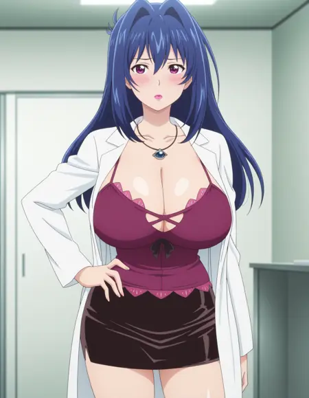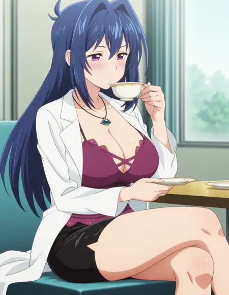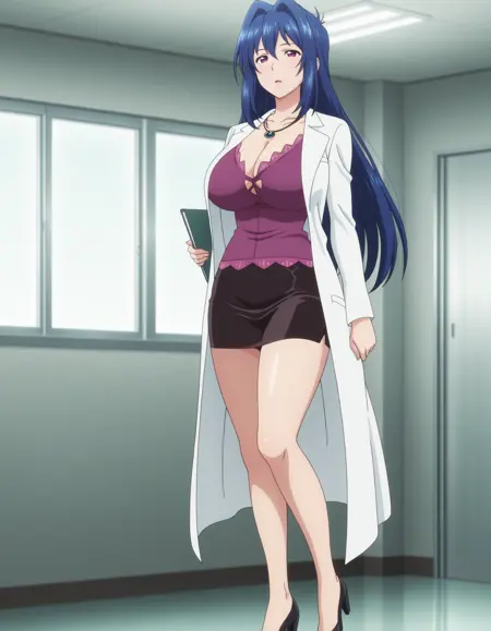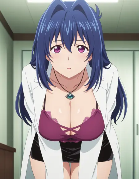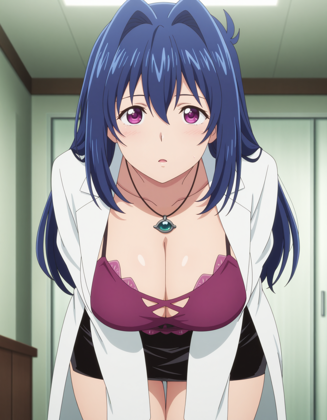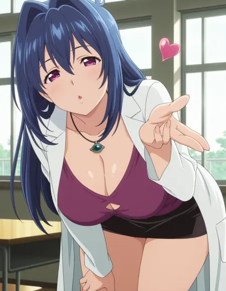 masterpiece,good quality,best quality,absurdres,highres,very awa,<lora:Aki Nijou:1>,Aki Nijou,mature female,blue hair,huge breasts,hair intakes,hair between eyes,purple eyes,lora:anime\_screencap-Illustrious:1,anime screencap,long hair,lab coat,purple top along with a short black skirt,necklace,hand on own hip,classroom,open window,looking at viewer,finger to mouth,cowboy shot,stepping,leg up,from below,stepping on desk,black heels,green lace panties