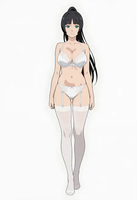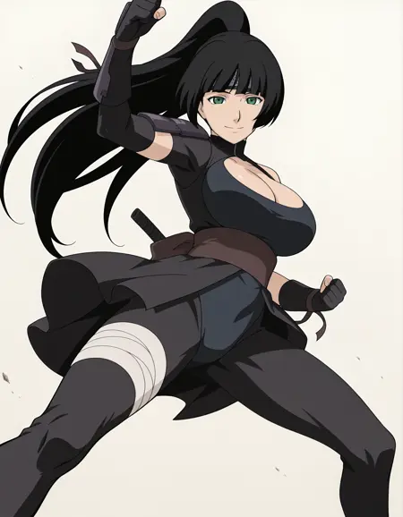 shizuka,black hair, high ponytail,large green eyes,bangs,