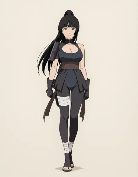 forehead protector,wearing dark ninja outfit with arm guards,short-sleeved on one side and sleeveless on the other,dark brown sash,thigh-high bandages,leggings,foot,