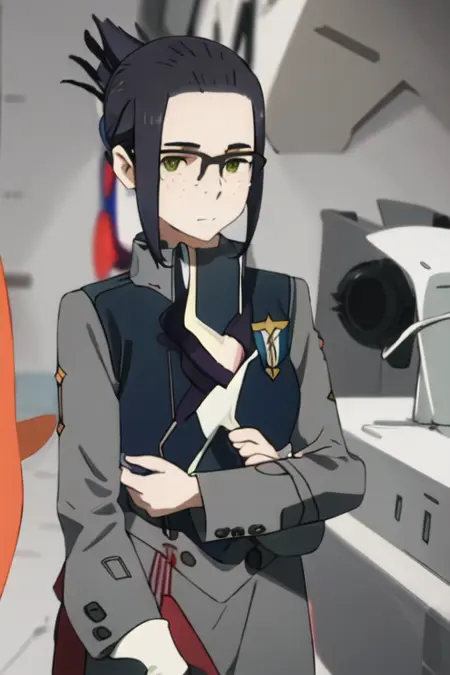 触发词为 ikuno_darlinginthefranxx,推荐标签为:best quality, masterpiece, highres, solo, {ikuno_darlinginthefranxx:1.15}, green_eyes, glasses, black_hair, freckles, folded_ponytail。