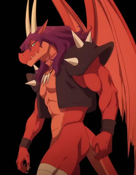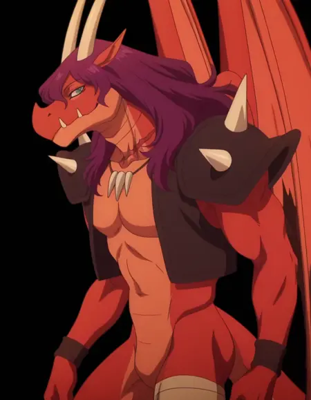 neck scar, green eyes, purple hair, long hair, fangs, horns, wings, tail, claws