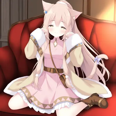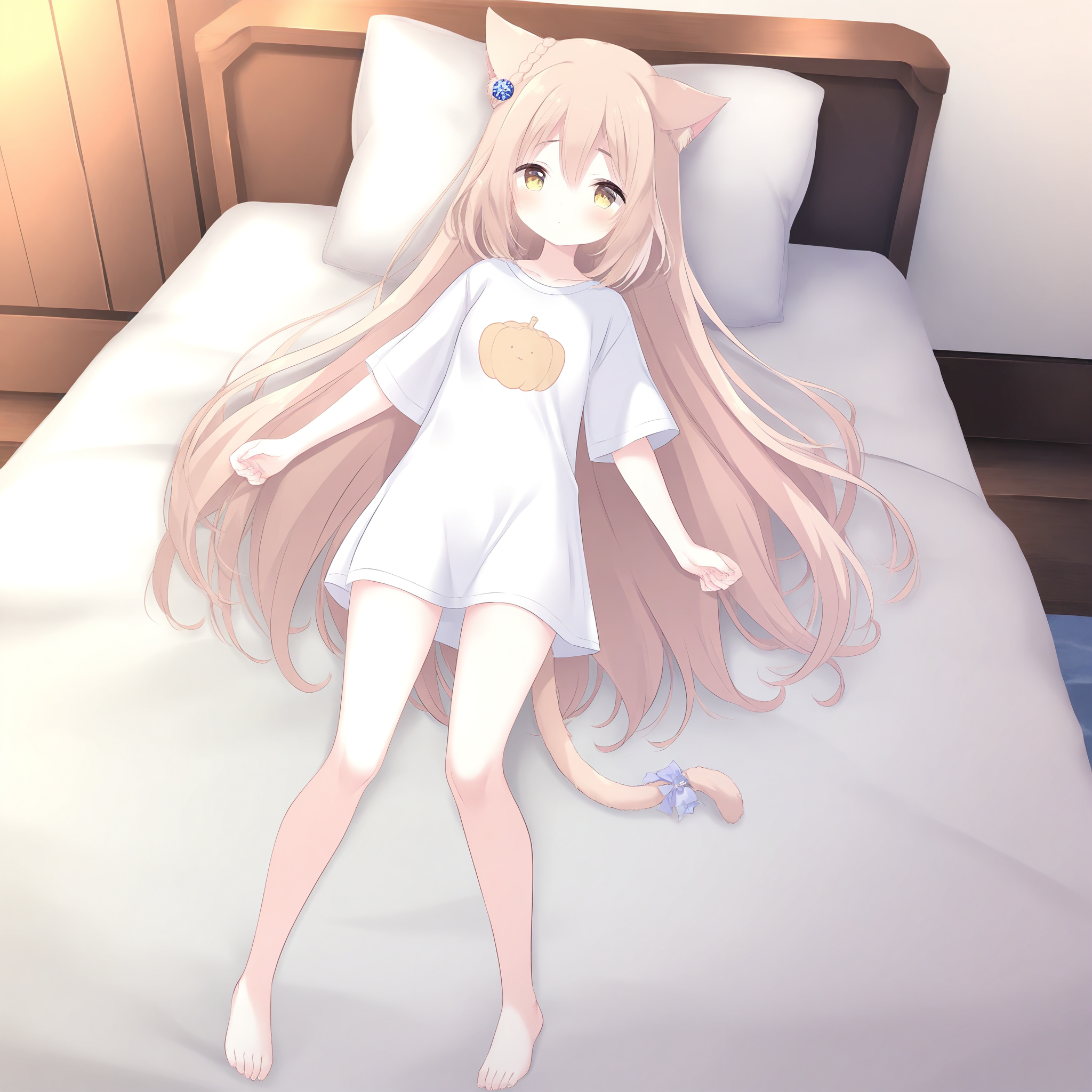 JA art,Mare Ashley Pecker,1girl,yellow eyes,small breasts,cat tail,cat ears,hair ornament,tail ornament,blonde hair,