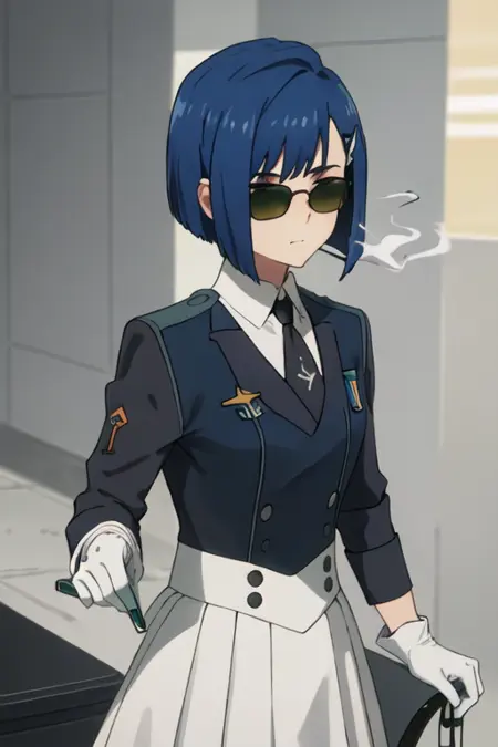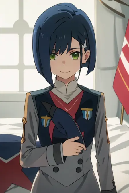 触发词为 ichigo_darlinginthefranxx,推荐标签为:best quality, masterpiece, highres, solo, {ichigo_darlinginthefranxx:1.15}, blue_hair, short_hair, green_eyes, hairclip, hair_ornament, closed_mouth, bangs, military。
