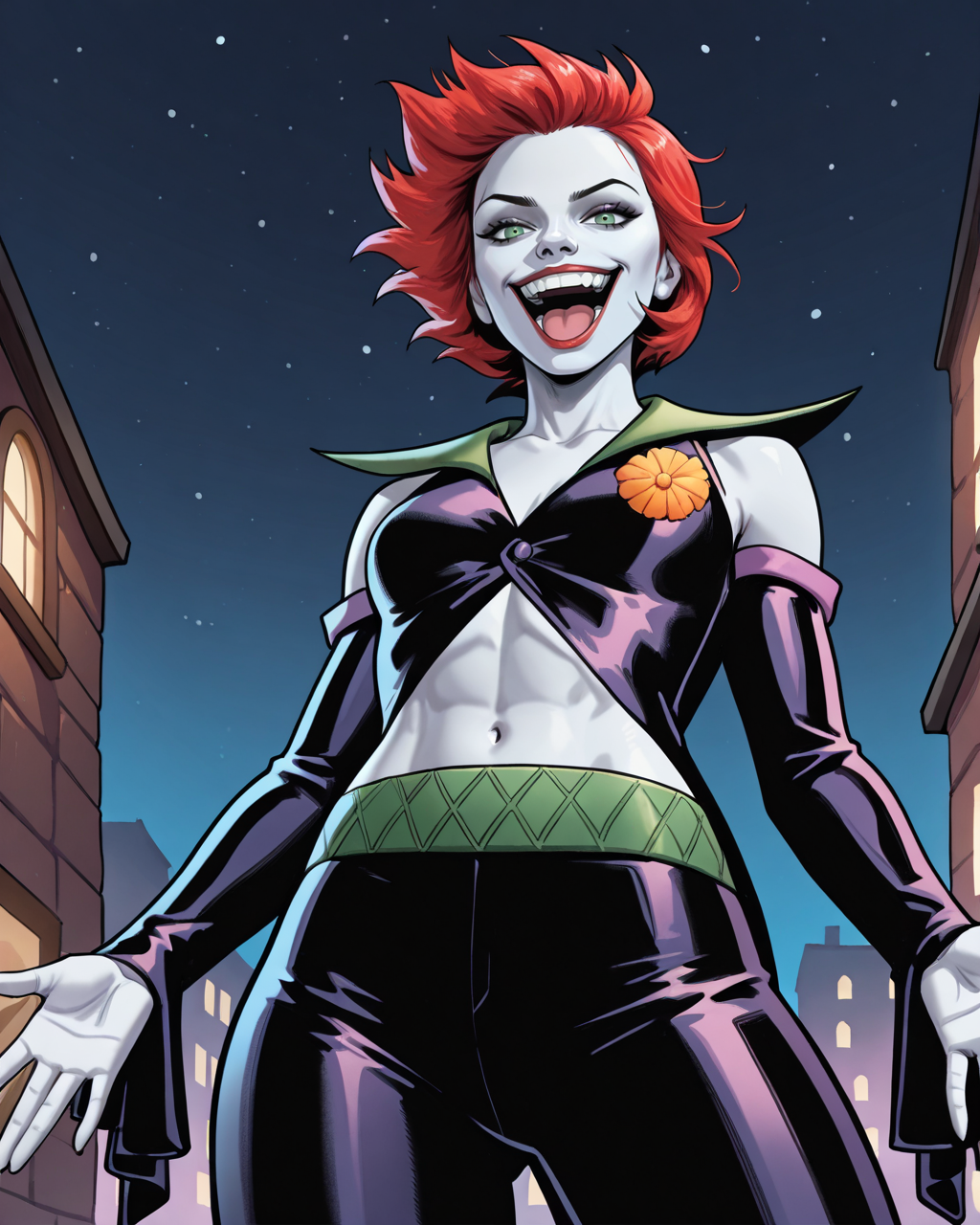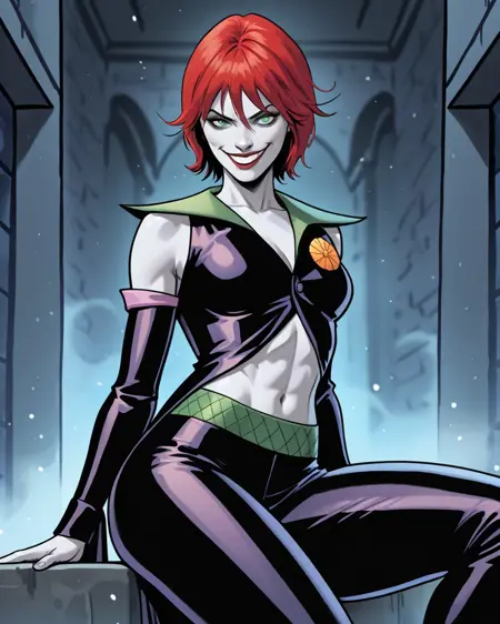 Triggers: 1girl, duela, albino skin, red hair, short hair, green eyes, jacket, detached sleeves, midriff, pants