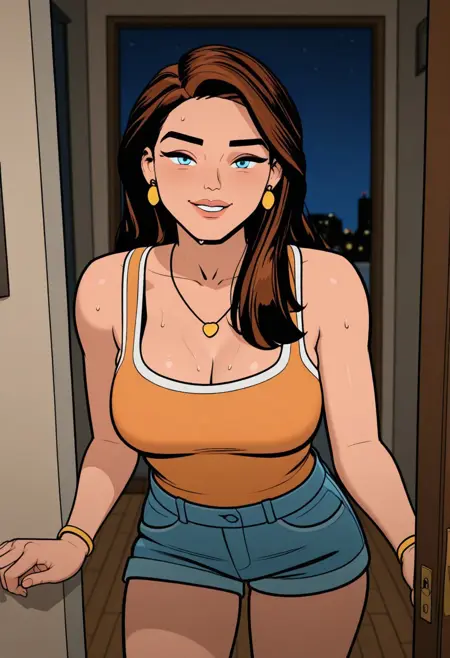 트리거 단어: AuntMayParker, 갈색 머리, 파란 눈, 목걸이, 귀걸이, 보석, 팔찌