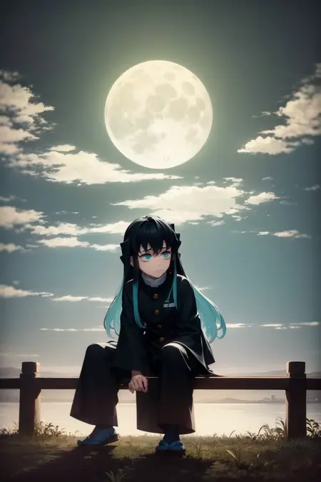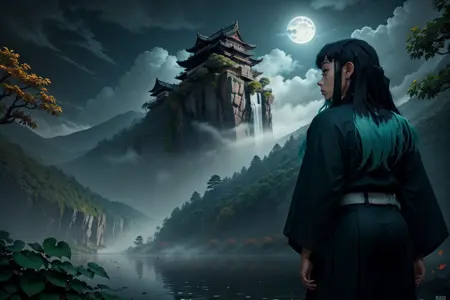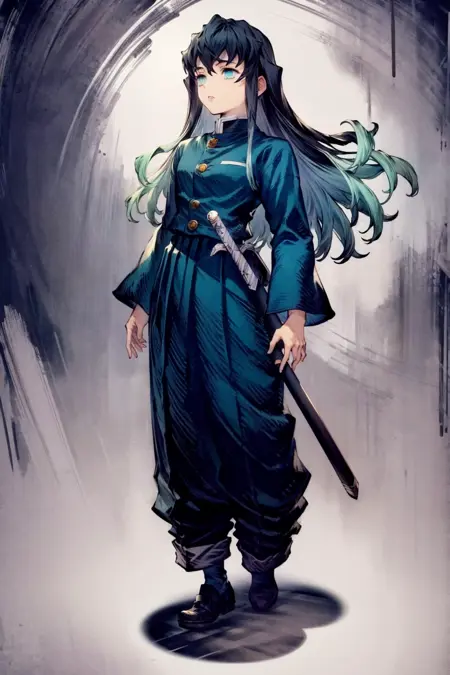 기타 프롬프트: 1boy, long hair, black hair, aqua hair, bangs, multicolored hair, sidelocks, long sleeves, aqua eyes, demon slayer uniform, pants