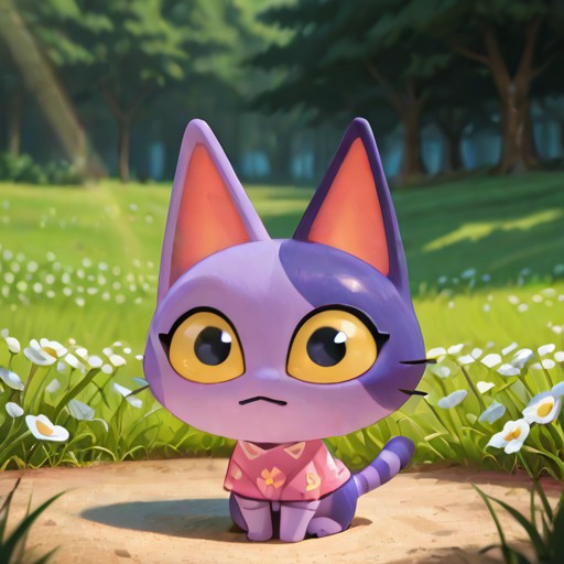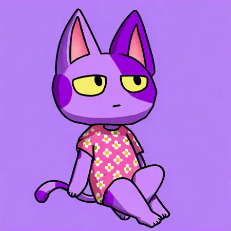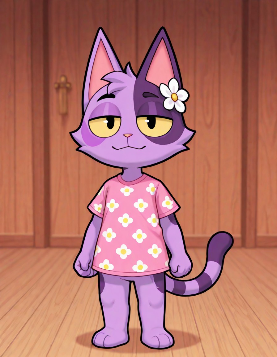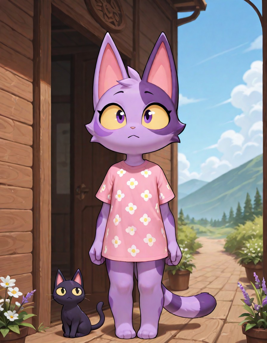 Bob-AC, cat, lavender skin with dark purple spot, dark purple fur on right side of the eye, two-tone fur, lavander and purple striped tail with purple tip, black cat eyes, yellow sclera, purple cat ears with pink inner ears, barefoot, pink shirt with white flower pattern