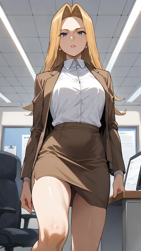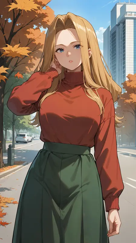 long hair, blonde hair, parted hair, blue eyes, white top, criss-cross halter, frills, black corset, white cape, black shorts, red pantyhose,