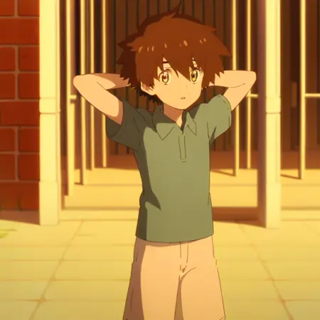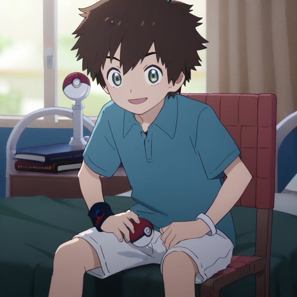 提示:男性,棕色头发,绿色眼睛,有领衬衫,短袖,左腕白色手环,右腕黑色腕带,珠宝,白色短裤,鞋子,室内(医院/沙发/海报(物体)/宝可梦玩偶/门口),室内(医院/病床/椅子/电视/钟表/书/宝可梦球灯/窗户/窗帘),室内(走廊/模糊背景),室外(屋顶/天空/砖墙/门/长椅),室外(墓地/天空/墓碑),车辆内部