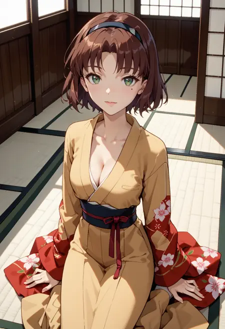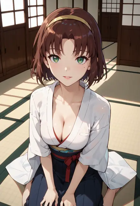主要标签: 1girl,独奏,绿色眼睛,短发,棕色头发,发带,眼下痣,痣,胸部,中等胸部,