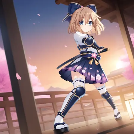 RomNep、Fol002、Rm_Smr、茶色の髪、短い髪、青い目、rom (neptunia)、日本服、日本鎧、侍、胸鎧、小手、白いシャツ、漢服、Vネック、濃い青色の鎧、濃い青色の手甲、プリーツスカート、フリル付きスカート、濃い青色のスカート、グラデーションスカート、花柄、濃い青色のリボン、ピンクの花、濃い青色のリボン、髪飾りのリボン、ゴールド縁取り、ふわふわの短い袖、白い袖、リボン縁取りの太もも長ズボン、白い太もも長ズボン、膝パッド、分離型レッグウェア、濃い青色のレッグウェア、重ね着レッグウェア、黒い足袋、黒いサンダル、