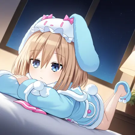 RomNep、Fol003、Rm_Paj、茶色の髪、短い髪、青い目、rom (neptunia)、ウサギの帽子、フリル付きの頭部装飾、ピンクのリボン、ポケット、パジャマ、ファー縁取り、ツートーンのカーディガン、薄い青色のカーディガン、白いカーディガン、白いファー、ファー縁取りのジャケット、閉じたジャケット、青いジャケット、ファーのチョーカー、ピンクのアスコット、ポンポン(衣装)、薄い青色のスカート、ファー縁取りのスカート、青い長袖、動物のスリッパ、